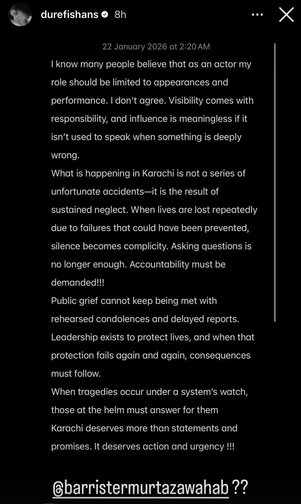 The actor urged urgent action and real solutions, stating that Karachi deserves more than statements it deserves protection, active leadership, and immediate steps to prevent future tragedies.